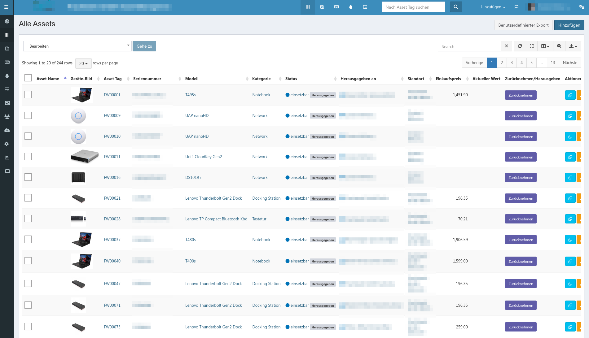 Snipe-IT ist ein Assetmanagement-System, mit dem primär IT-Gegenstände wie Laptops etc., aber eigentlich auch alles andere verwaltet werden kann. Gegenstände können mit Standard-Orten versehen werden und auf Knopfdruck an Nutzer herausgegeben und zurückgenommen werden.