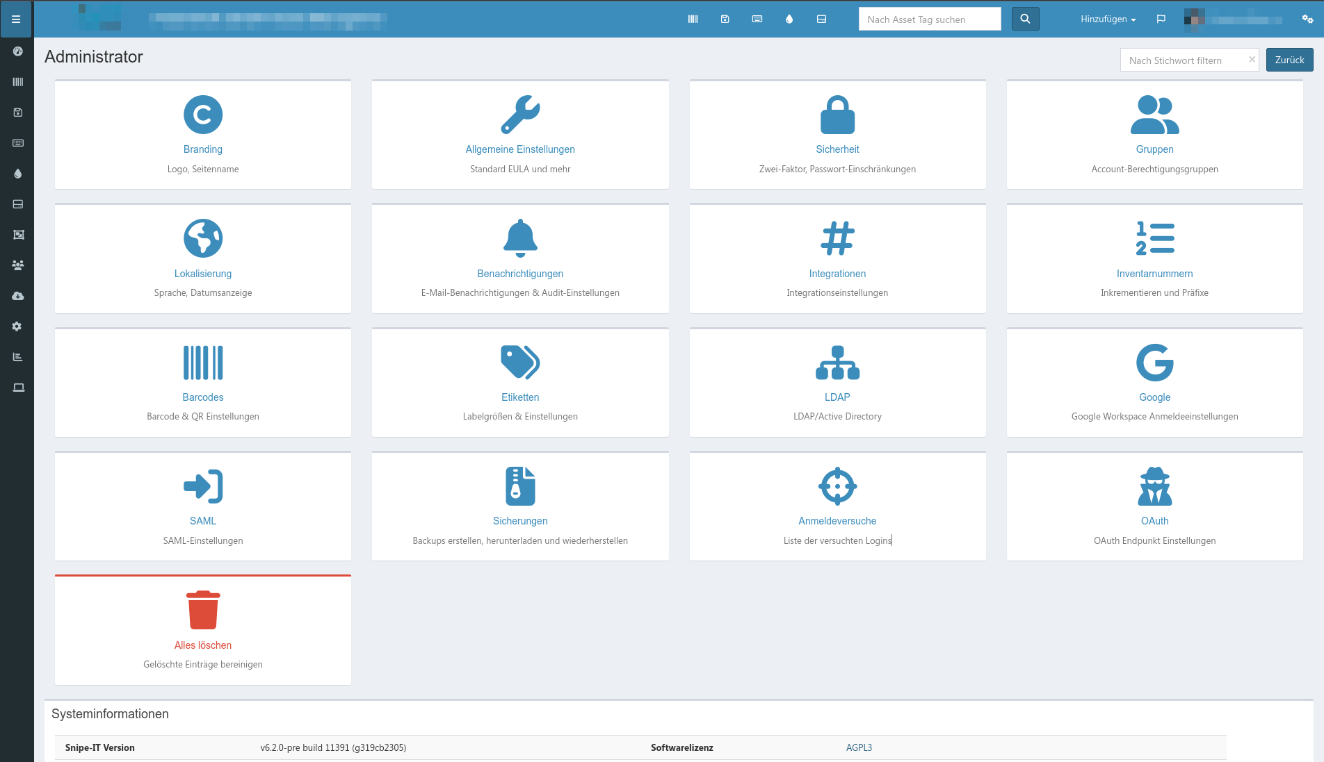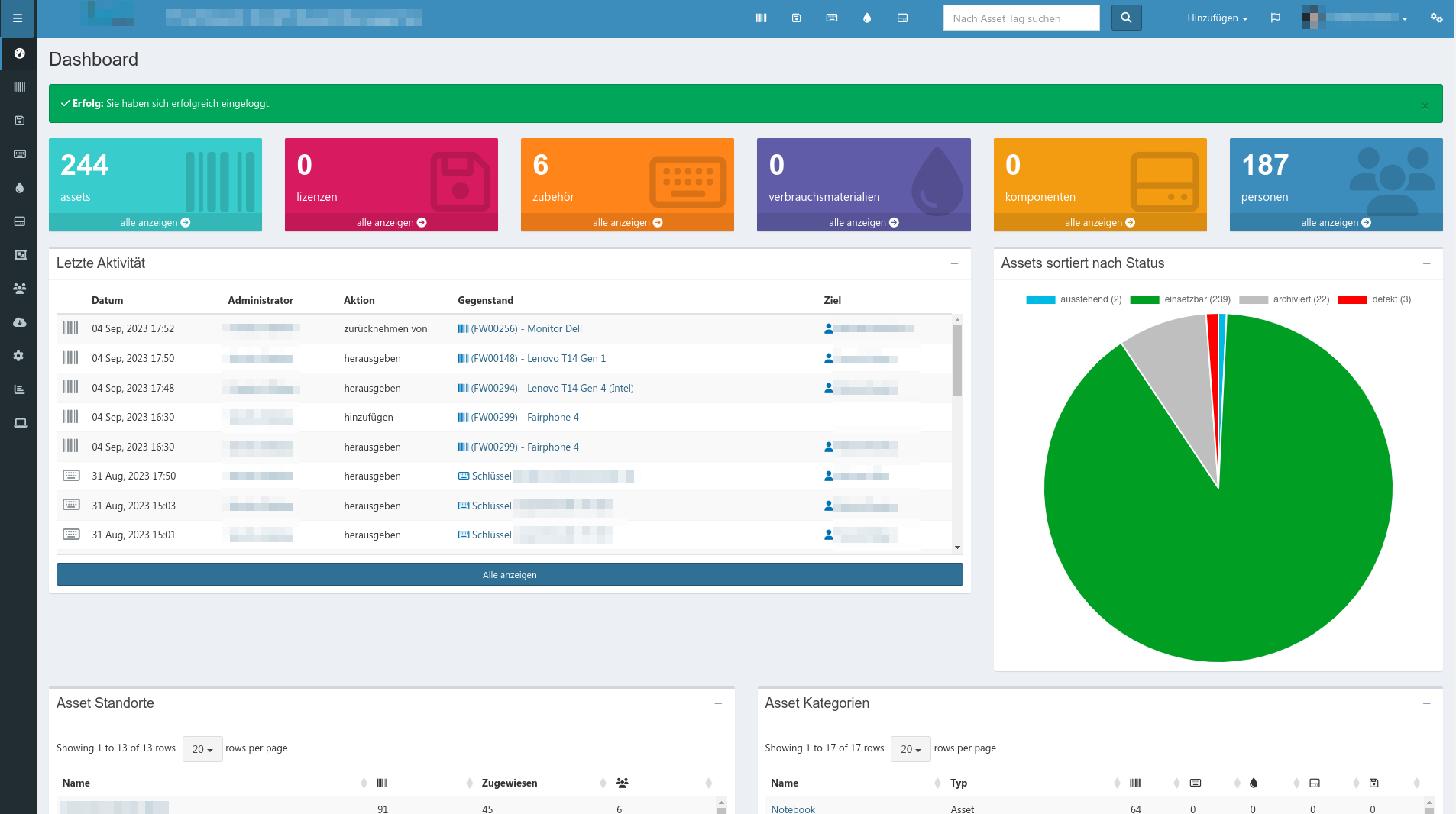 Neben Assets können Verbrauchsmaterialien, Firmen, Abteilungen, Hersteller, Typen, Bundles und noch einiges mehr gepflegt werden.
