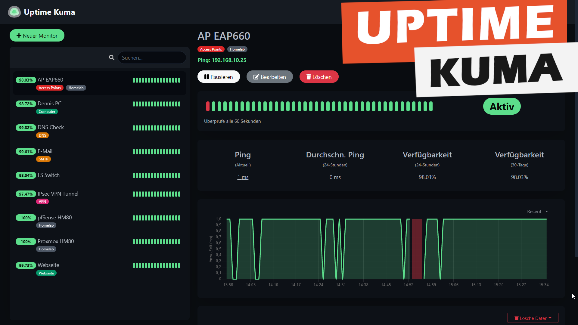 Uptime Kuma ist eine OpenSource Software zur Überwachung von Diensten, Servern und Endpunkten. Sie ermöglicht es, die Erreichbarkeit und den Status von Anwendungen kontinuierlich zu prüfen und bei Ausfällen oder Problemen automatisch zu benachrichtigen.