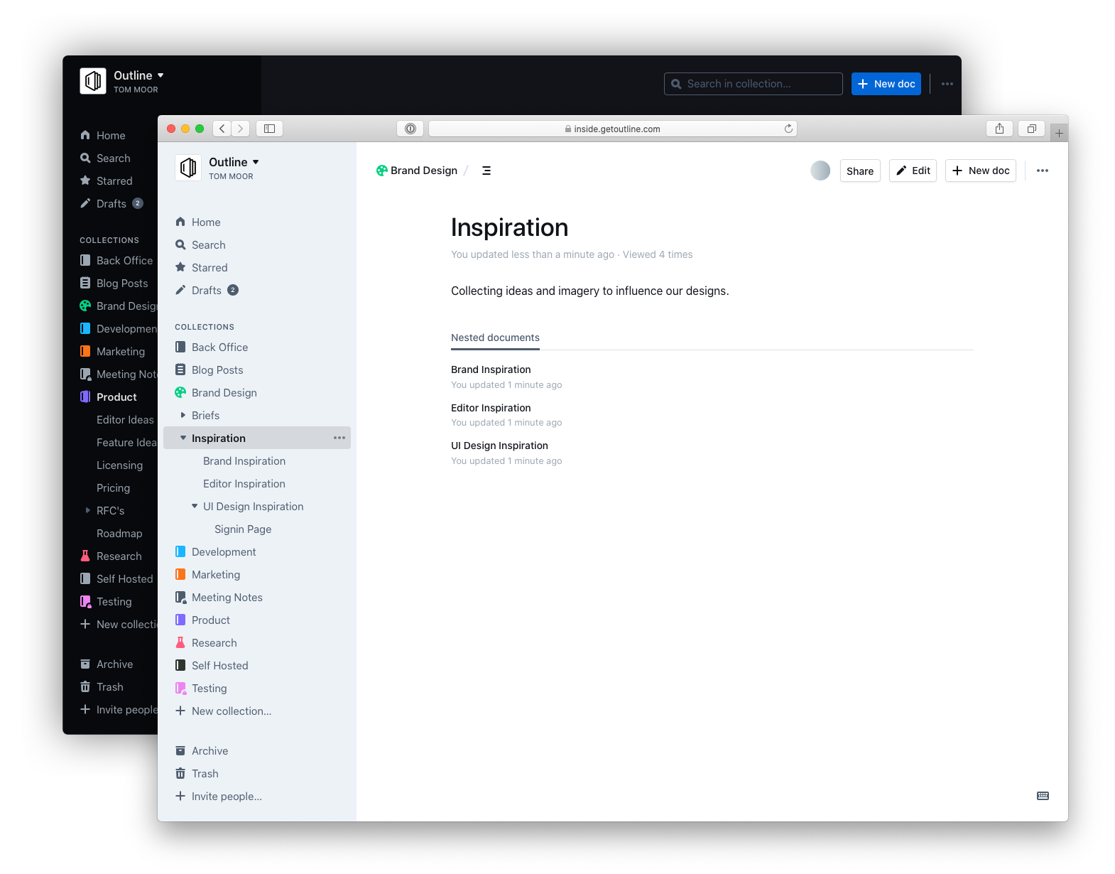 In Outline werden Inhalte in Sammlungen und Dokumenten organisiert, die sich übersichtlich verschachteln lassen. Die Bearbeitung erfolgt über einen modernen Webeditor mit Markdown-Unterstützung, sodass Inhalte schnell erstellt und formatiert werden können. Änderungen werden versioniert, wodurch frühere Stände jederzeit nachvollzogen oder wiederhergestellt werden können.