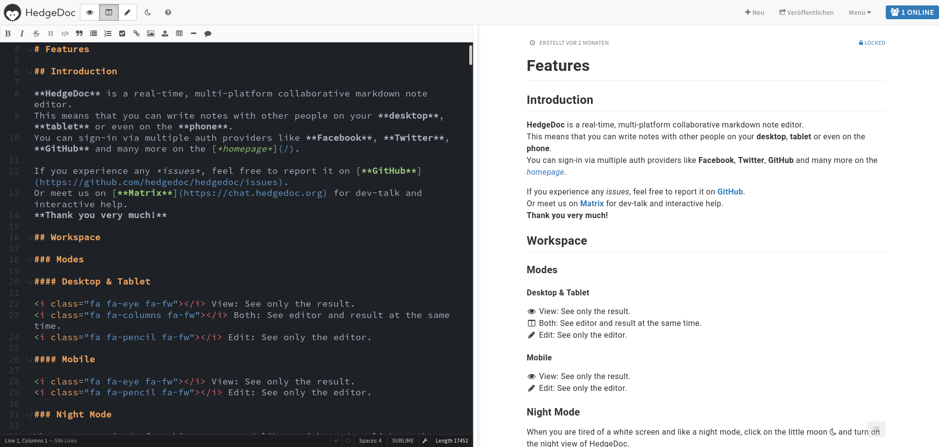 Hedgedoc ist ein etwas nerdiger Online-Editor, mit dem kollaborativ Markdown geschrieben werden kann. Auf der linken Seite wird der Markdown-Text angezeigt, rechts dazu die visuelle Version. Jede Änderung an einem Text wird sofort bei allen Menschen angezeigt, die das Dokument geöffnet haben.